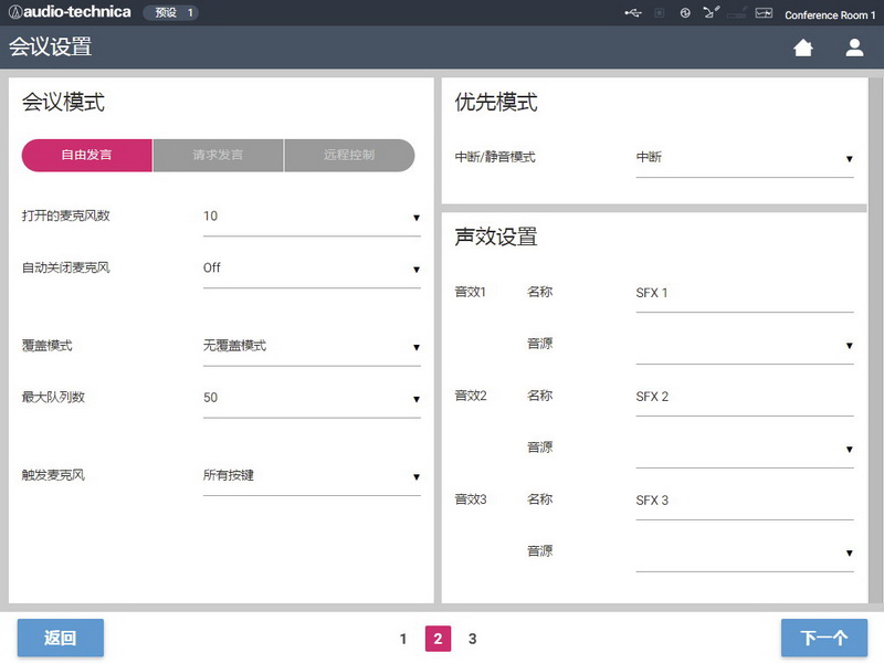 与常规手拉手会议系统一样,ATUC-50系统也设有多种发言模式,如“自由发言”、“请求发言”、“远程控制”以及各种“覆盖设置”模式和灵活的“声控触发”模式。