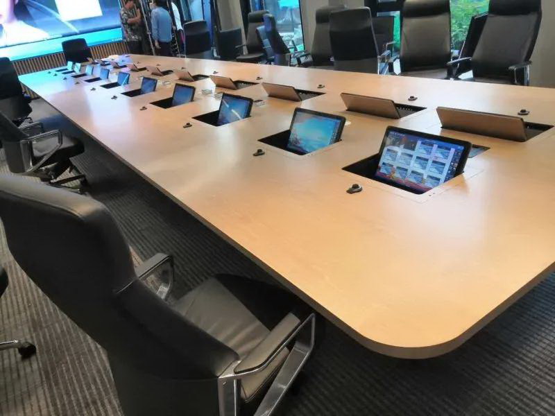 2、会议桌有升降式触摸屏,既要配合好无纸化,话筒拾音必须达到最佳效果,无杂音。